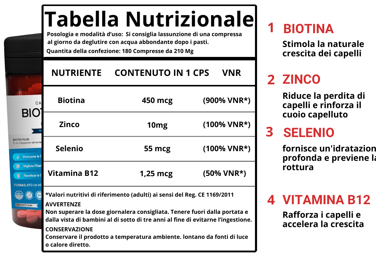 La Biotina stimola la crescita dei capelli, mentre il Selenio, la Vitamina B12 e lo Zinco lavorano insieme per supportare la salute dei follicoli piliferi e combattere gli effetti negativi del DHT, massimizzando l'efficacia nel prevenire la perdita di capelli.