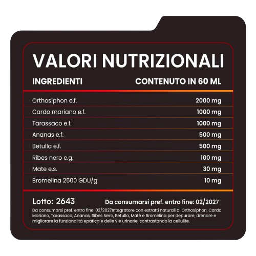Integratore con estratti naturali di Orthosiphon, Cardo Mariano. Tarassaco. Ananas. Ribes Nero. Betulla. Mate e Bromelina per depurare, drenare e migliorare la funzionalità epatica e delle vie urinarie, contrastando la cellulite.